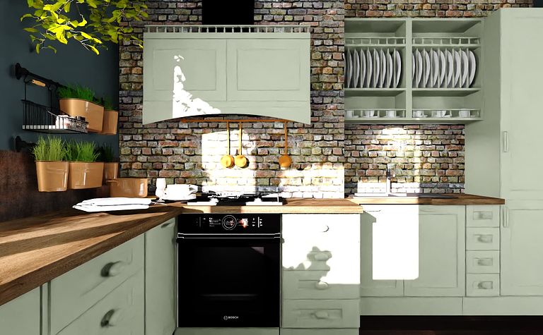 Kuchnia z zielonymi meblami i drewnianym blatem
