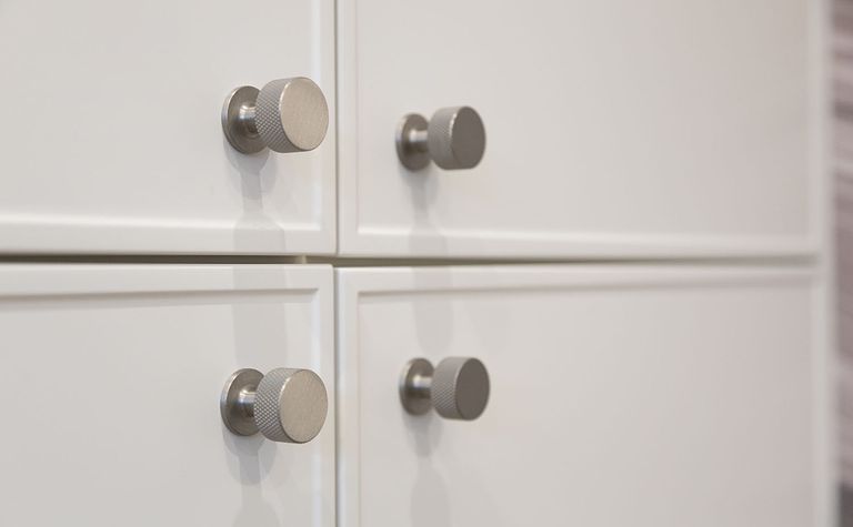 Meble kuchenne z białymi frontami i metalowymi uchwytami