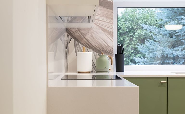 Kuchnia z zielonymi meblami i szarym blatem