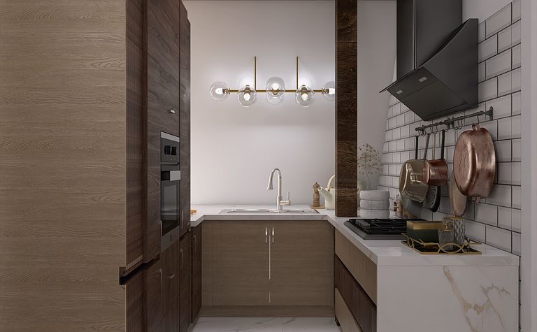 Kuchnia z drewnianymi meblami i białym blatem