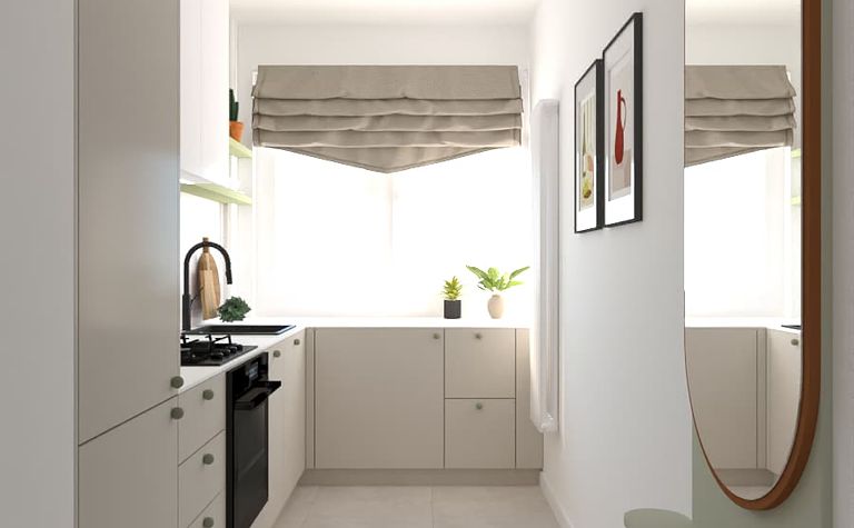 Kuchnia z jasnymi meblami i roślinami