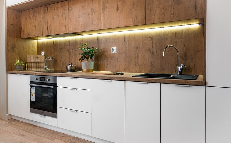 Kuchnia z drewnianym blatem i jasnymi meblami