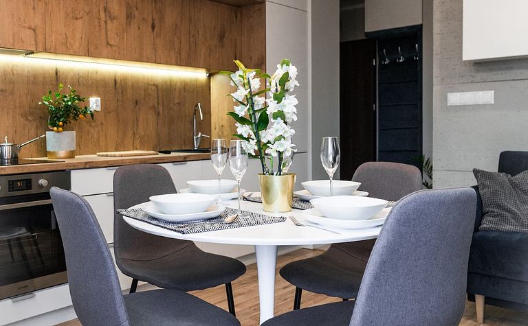Kuchnia z drewnianymi akcentami i białym stołem