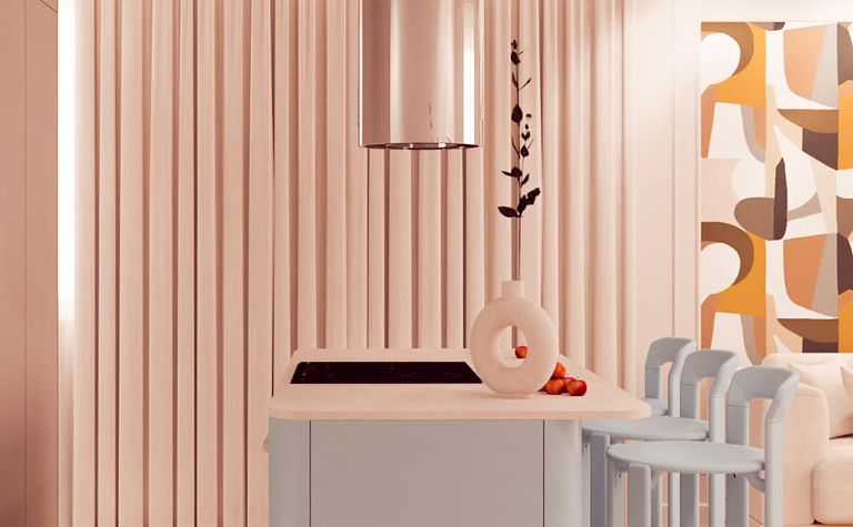 Kuchnia z jasnymi meblami i metalowym wyciągiem