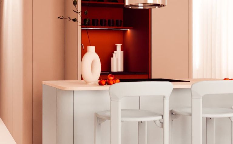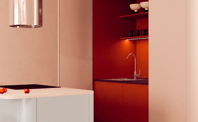 Kuchnia z białym blatem i czerwonymi akcentami
