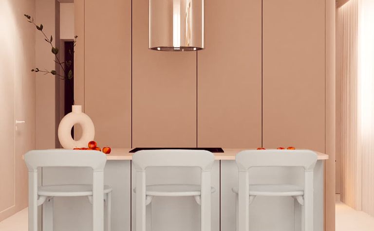 Kuchnia z pastelowymi meblami i surowymi akcentami