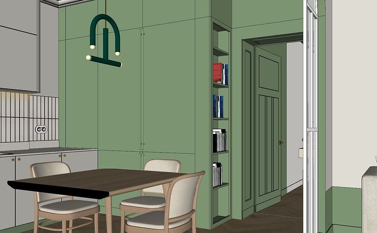 Kuchnia z zielonymi akcentami i drewnianym stołem