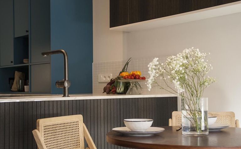 Kuchnia z niebieskimi akcentami i drewnianym blatem