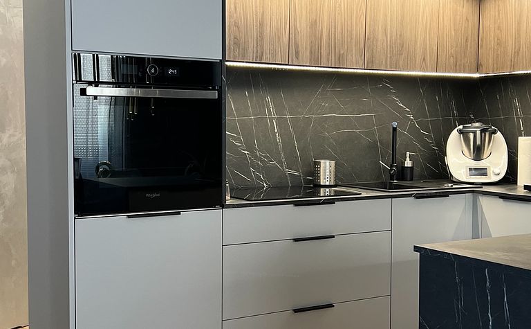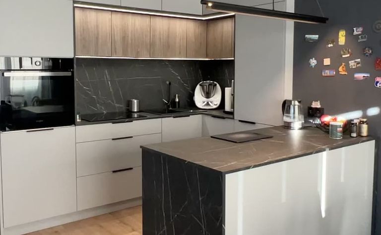 Kuchnia z czarnym blatem i szarymi meblami