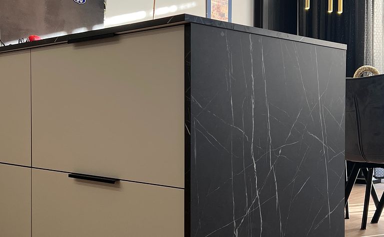 Kuchnia z czarnym blatem i beżowymi meblami