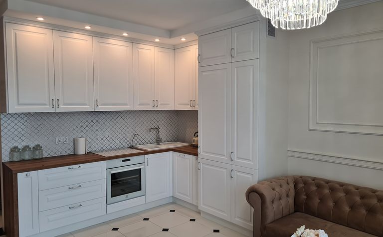 Kuchnia z białymi meblami i drewnianym blatem