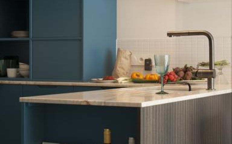 Kuchnia z niebieskimi szafkami i marmurowym blatem