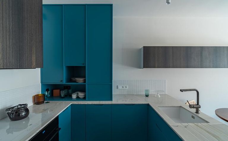 Kuchnia z niebieskimi meblami i białym blatem