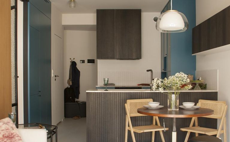 Kuchnia z drewnianymi akcentami i szarymi krzesłami