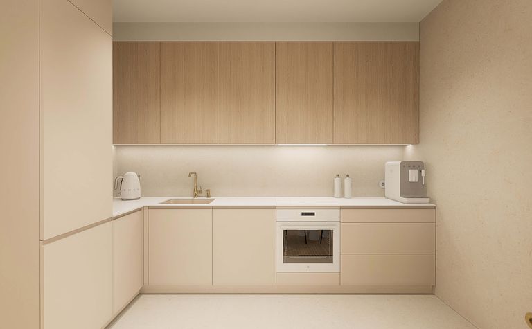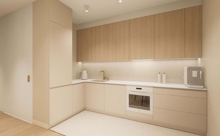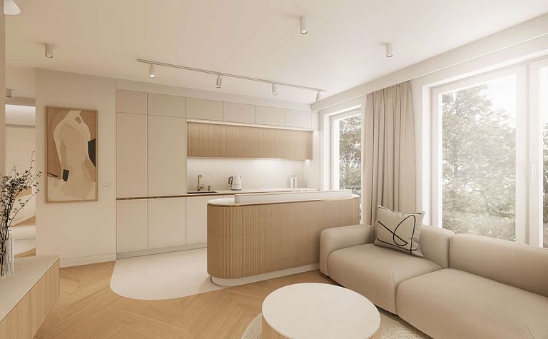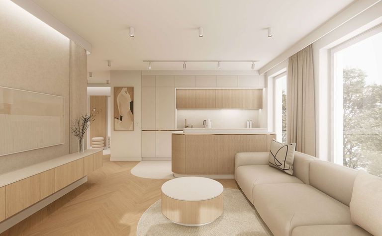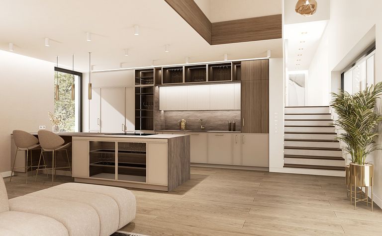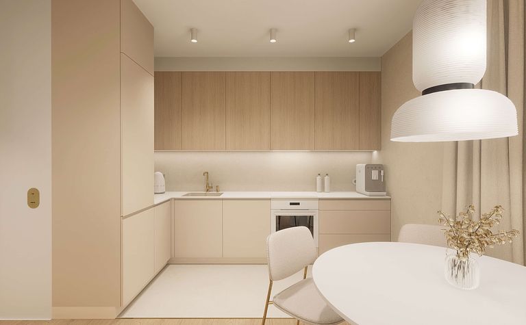 Kuchnia z drewnianymi akcentami i beżowymi meblami