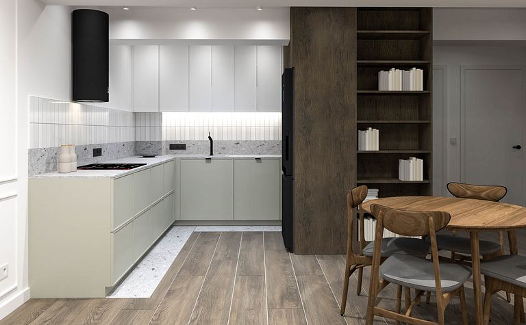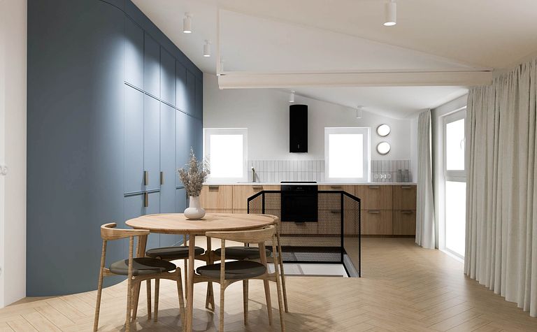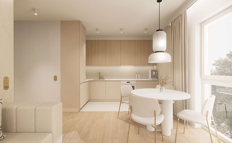 Wnętrze z jasną kuchnią i drewnianym stołem