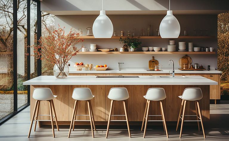 Kuchnia z drewnianymi akcentami i jasnymi meblami