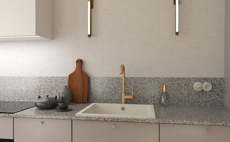 Kuchnia z szarym blatem i brązowymi akcentami