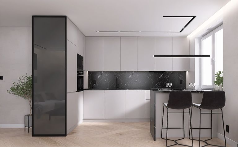 Kuchnia z jasnymi meblami i ciemnym blatem
