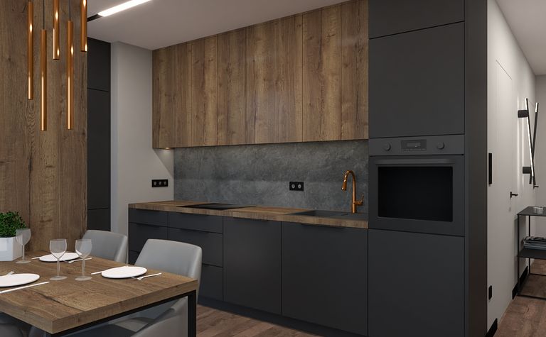 Kuchnia z drewnianymi meblami i czarnymi akcentami