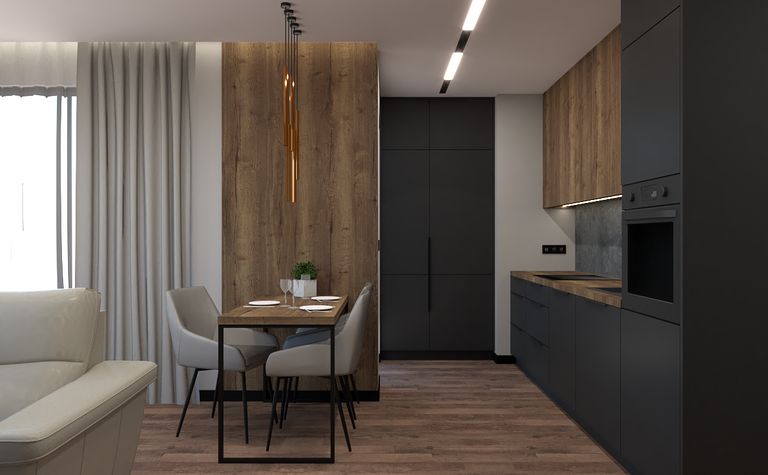 Kuchnia z drewnianymi elementami i czarnymi akcentami