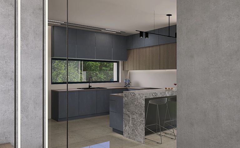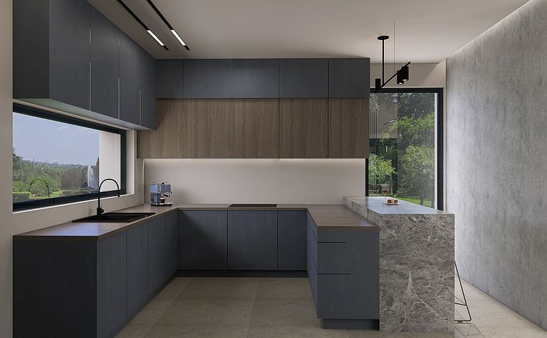 Kuchnia z drewnianymi akcentami i szarym blatem