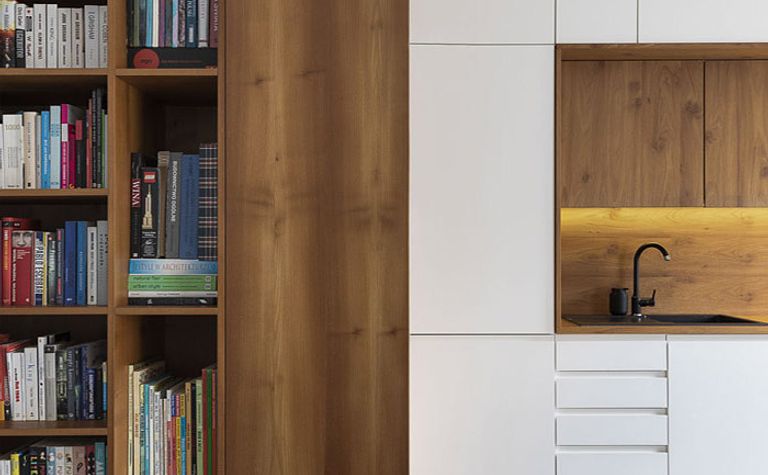 Kuchnia z drewnianą zabudową i białymi meblami