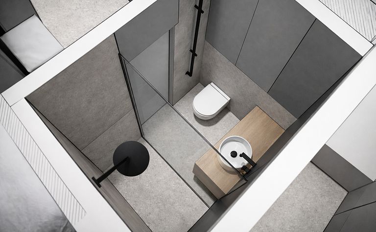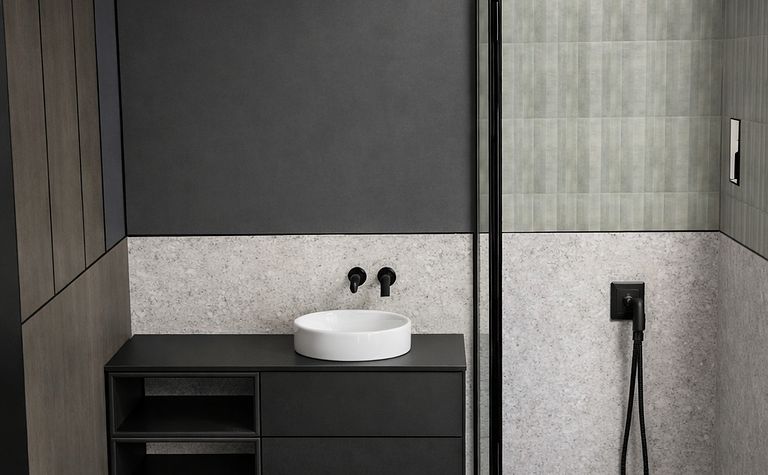 Łazienka z czarną armaturą i szarymi płytkami