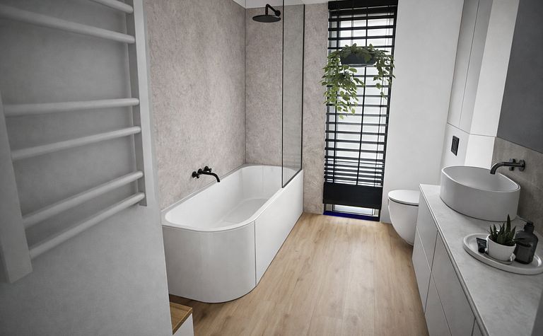Łazienka z białą wanną i szarymi akcentami
