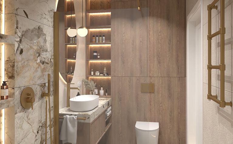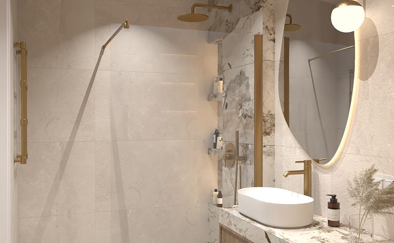 Łazienka z jasnymi ścianami i złotymi akcentami