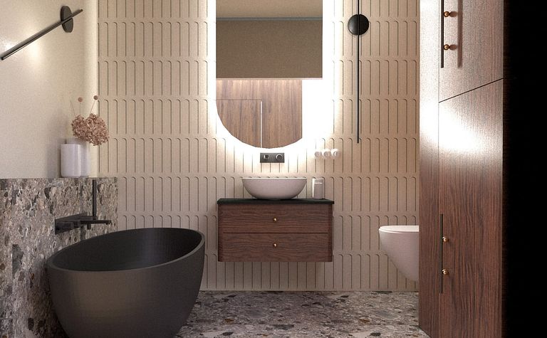 Łazienka z ciemną wanną i drewnianymi akcentami