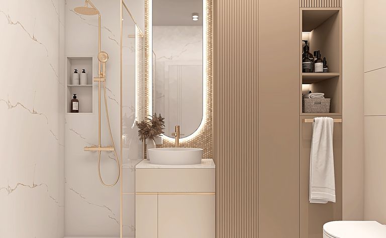 Łazienka z beżowymi meblami i złotymi akcentami