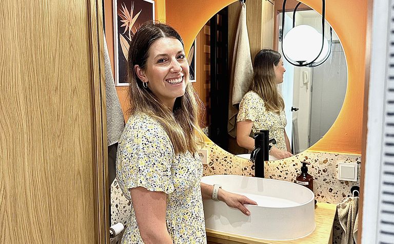 Łazienka z drewnianą szafką i okrągłym lustrem