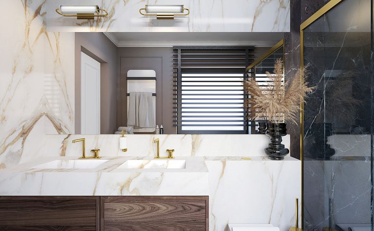 Łazienka z marmurową umywalką i złotymi akcentami