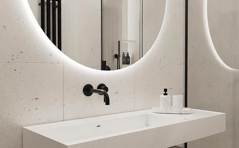 Łazienka z okrągłym lustrem i czarnymi akcentami