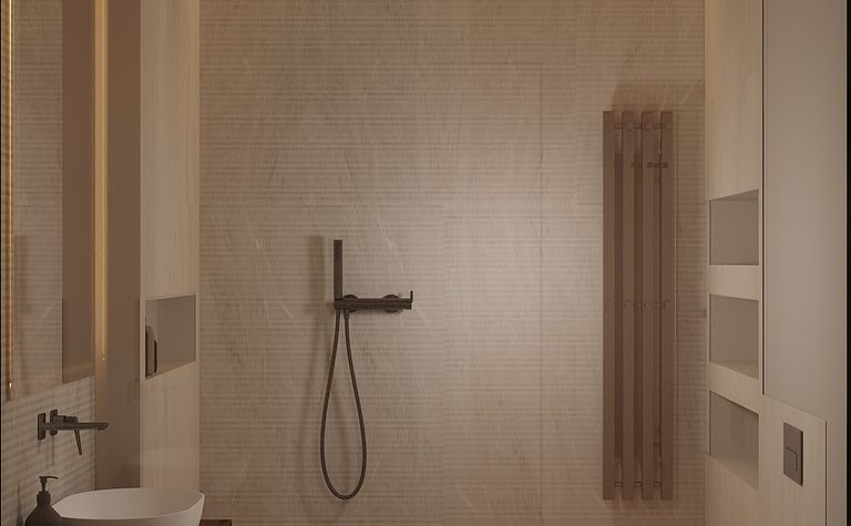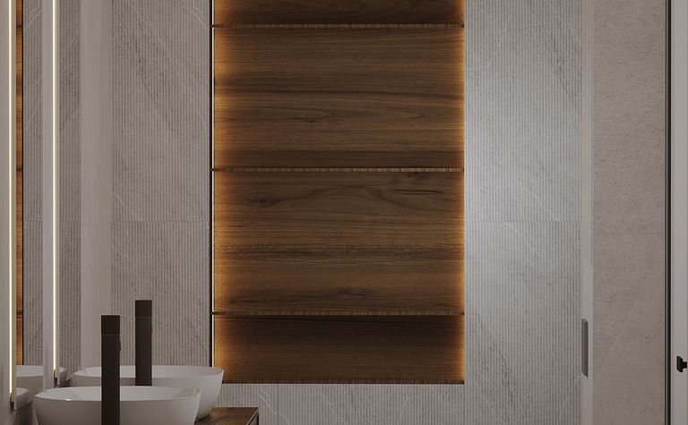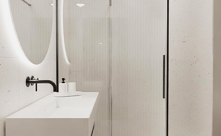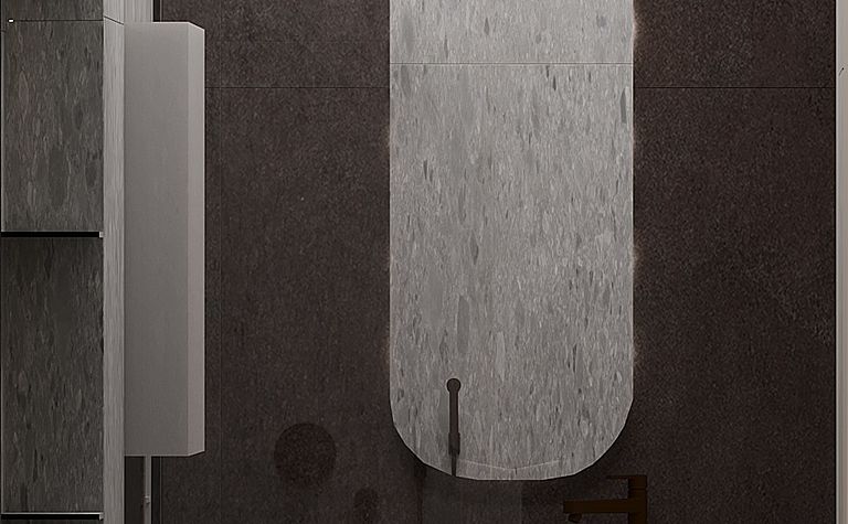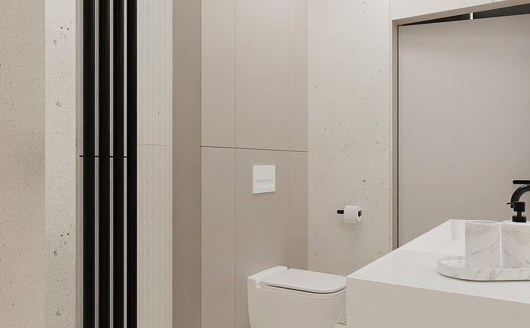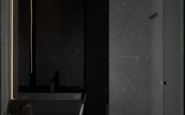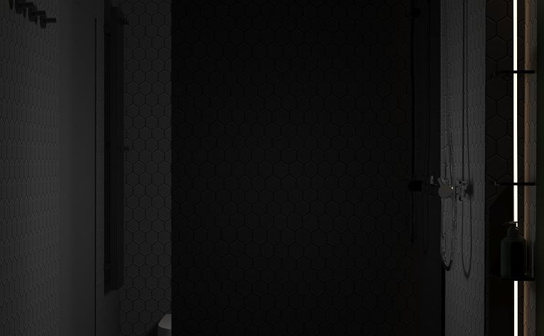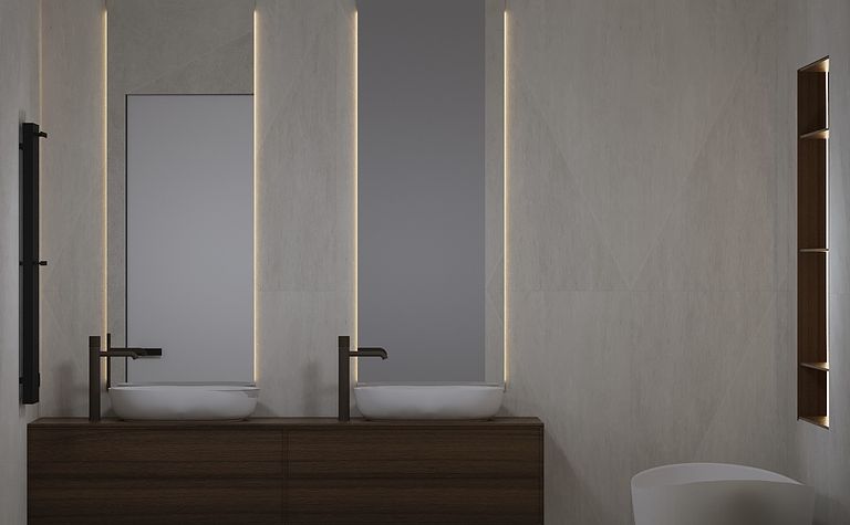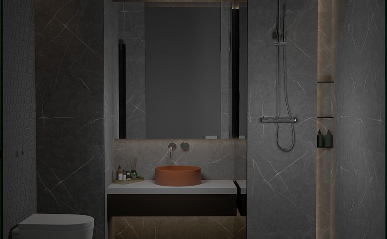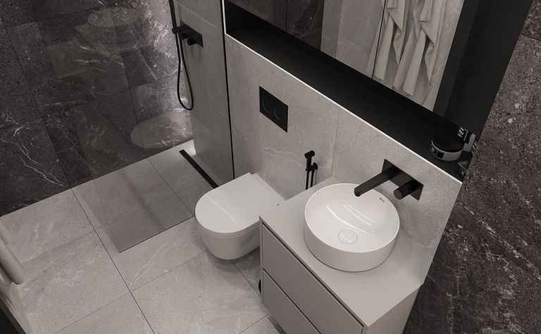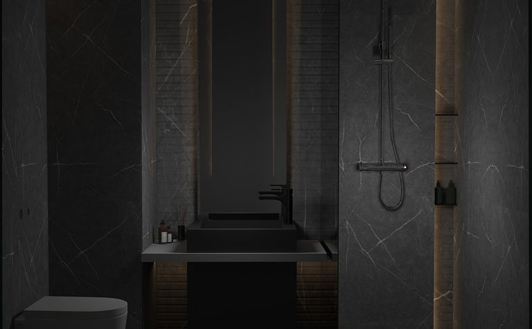 Łazienka z szarymi płytkami i czarnym oświetleniem
