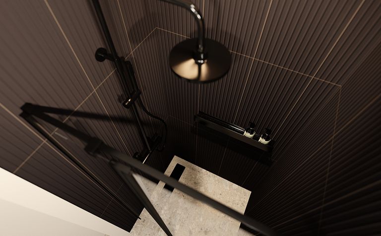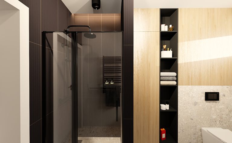 Łazienka z czarnymi elementami i nowoczesnym prysznicem