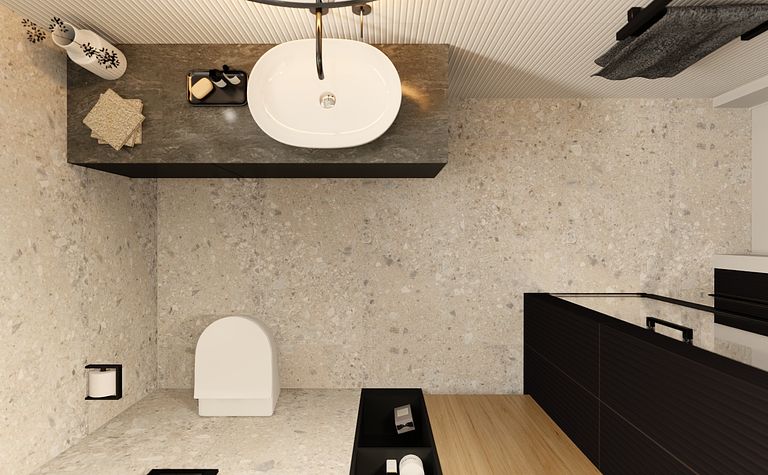 Toaleta z szarymi płytkami i drewnianym blatem