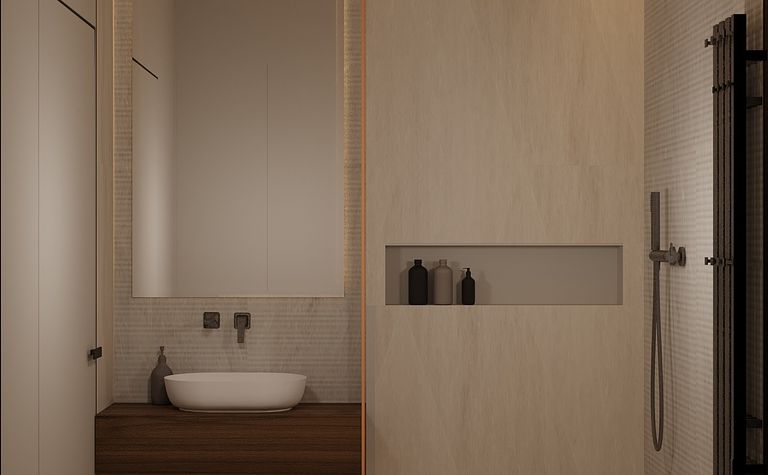 Łazienka z jasnymi płytkami i drewnianą umywalką