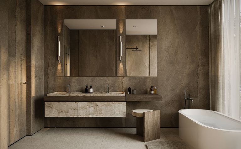 Łazienka z drewnianymi akcentami i nowoczesnym oświetleniem