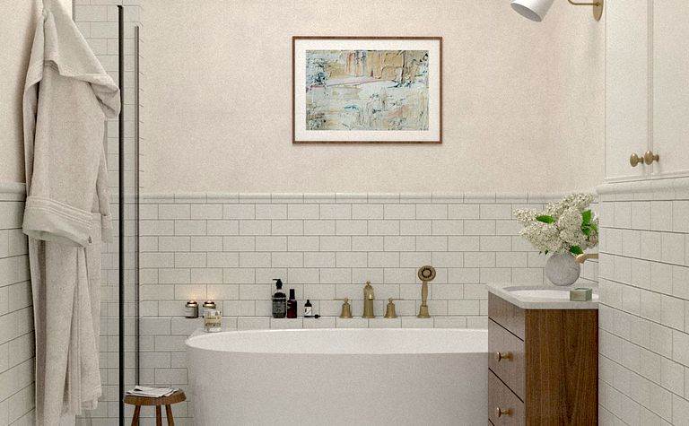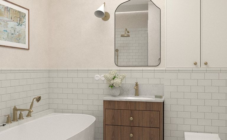 Łazienka z drewnianymi meblami i białymi kafelkami