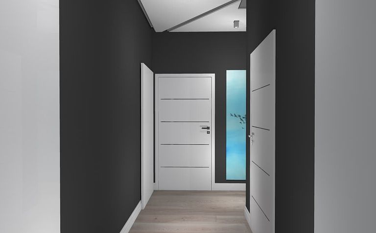 Przedpokój z białymi drzwiami i czarnymi ścianami