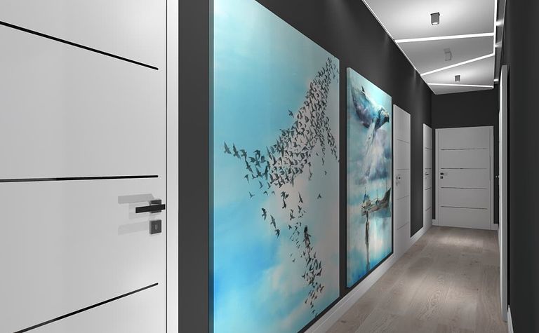 Korytarz z białymi drzwiami i niebieskimi obrazami