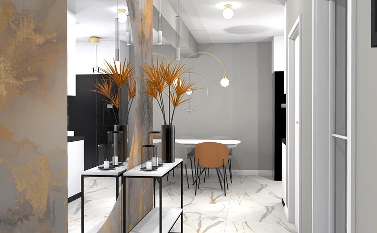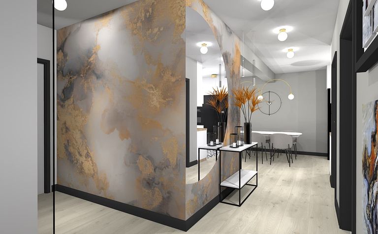 Wnętrze z szarymi ścianami i złotymi akcentami