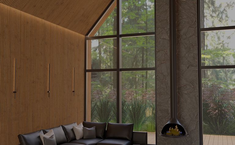 Wnętrze salonu z kominkiem i drewnianymi akcentami