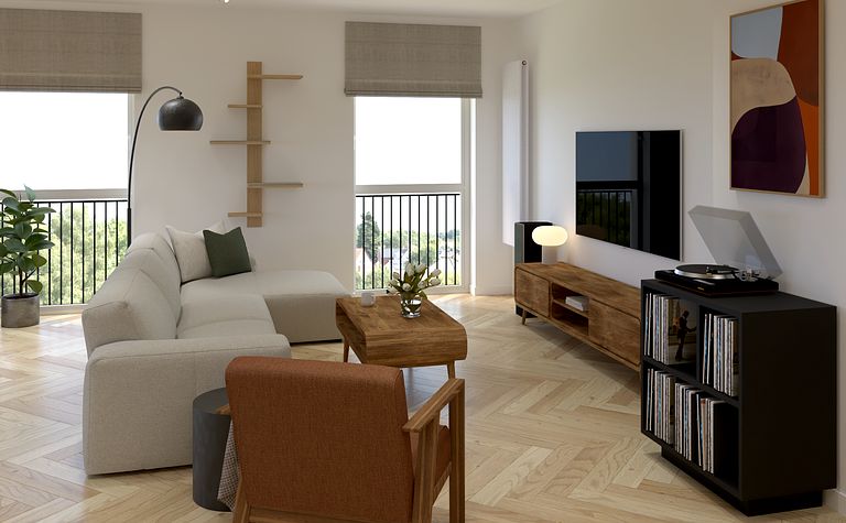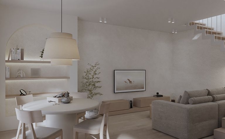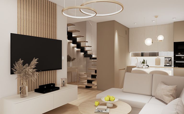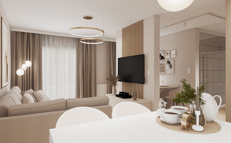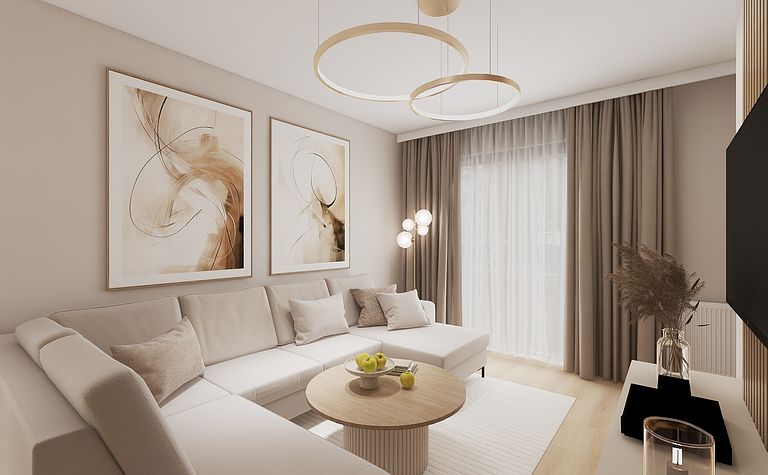Wnętrze salonu z beżową sofą i białymi akcentami