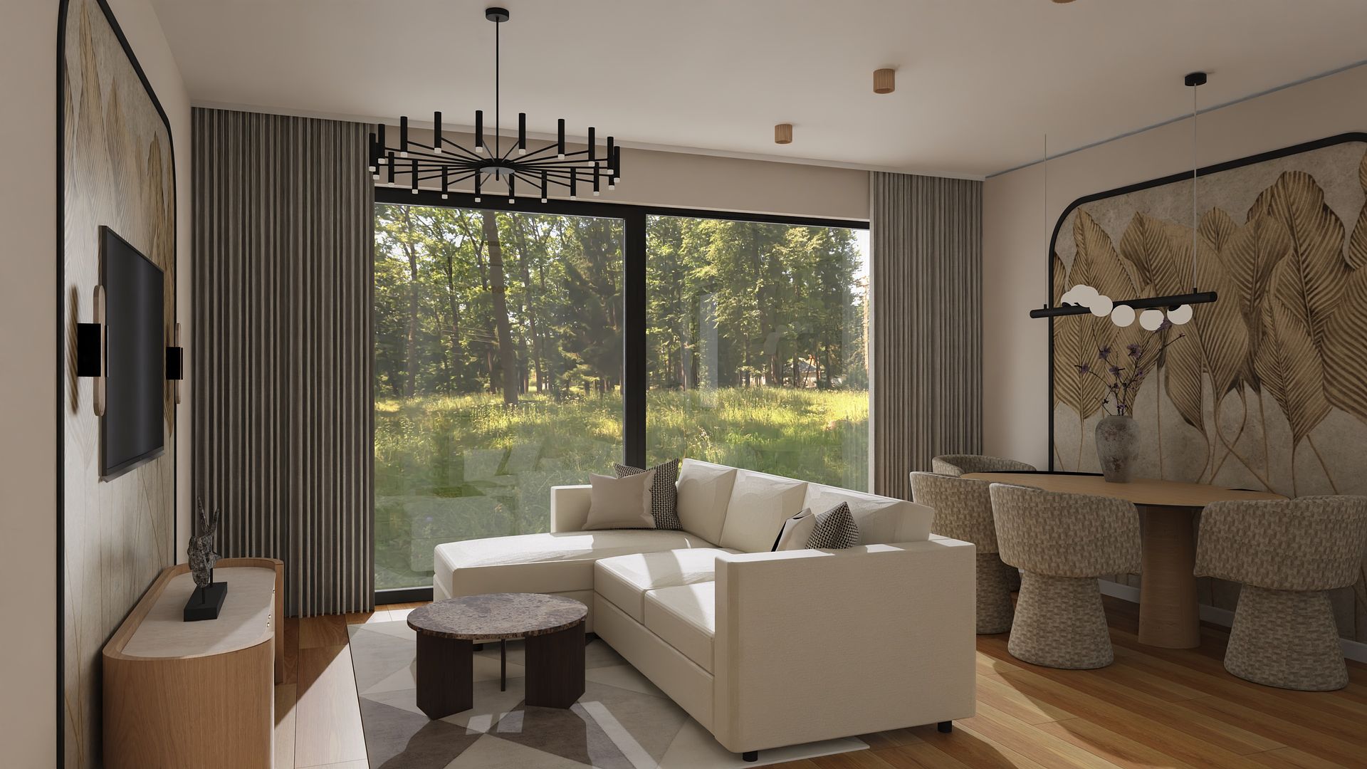 Salon z dużą sofą i nowoczesnym oświetleniem
