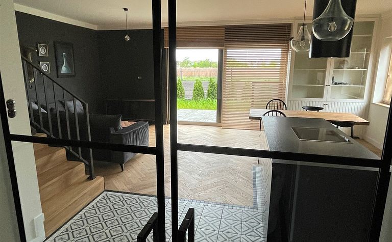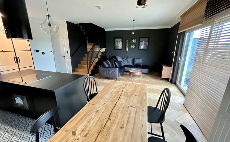Wnętrze z czarną kuchnią i drewnianym stołem