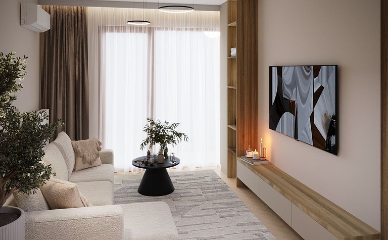 Salon z białą sofą i telewizorem na ścianie