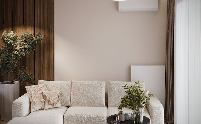 Salon z jasną sofą i drewnianymi akcentami